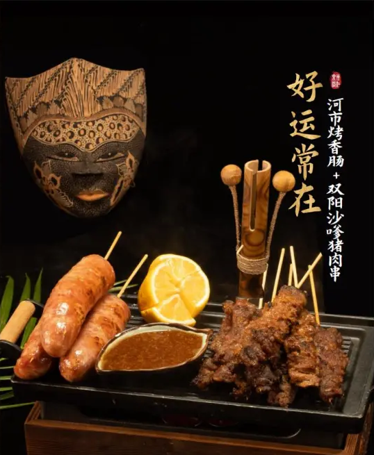 在由十八道菜品构成的“洛水仙山宴”中,紧随首道佳肴登场的第二道菜名为“好运常在”。此道菜品匠心独具地将河市烤香肠的醇厚地道与双阳沙嗲猪肉串的南洋风味合二为一,不仅滋味层次丰富,更巧妙承载了美好的寓意。