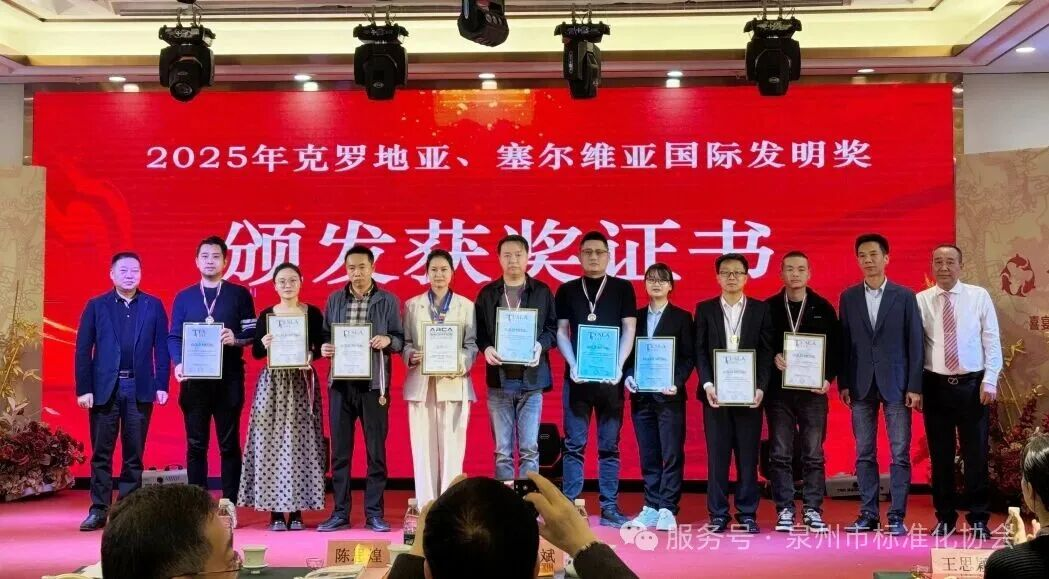 市科协陈思煌副主席、市市监局刘华调研员、朱斌理事长为获得2025年克罗地亚、塞尔维亚国际发明奖的获奖单位代表颁发奖牌证书。