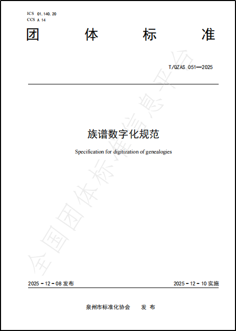 为顺应文化遗产数字化保护的时代要求,推动族谱的科学化、规范化保存与利用,经征求意见、专家审查等多个把关环节后,团体标准《族谱数字化规范》(标准编号:T/QZAS 051-2025)已于近期正式批准发布,自2025年12月10日起实施。