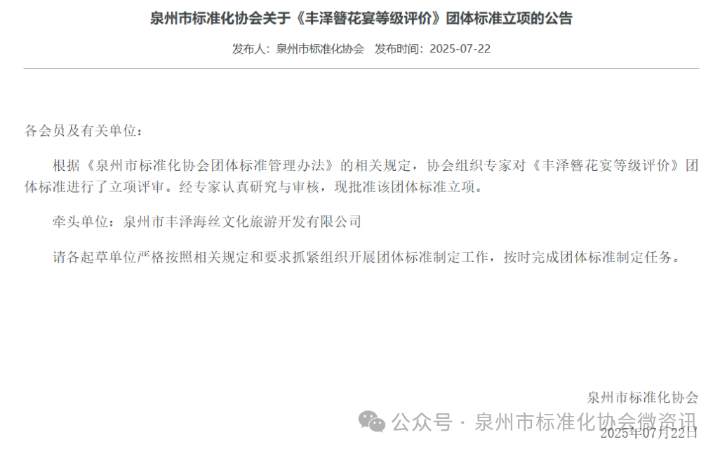 请泉州市丰泽海丝文化旅游开发有限公司等起草单位严格按照相关规定和要求抓紧组织开展团体标准制定工作,按时完成团体标准制定任务。